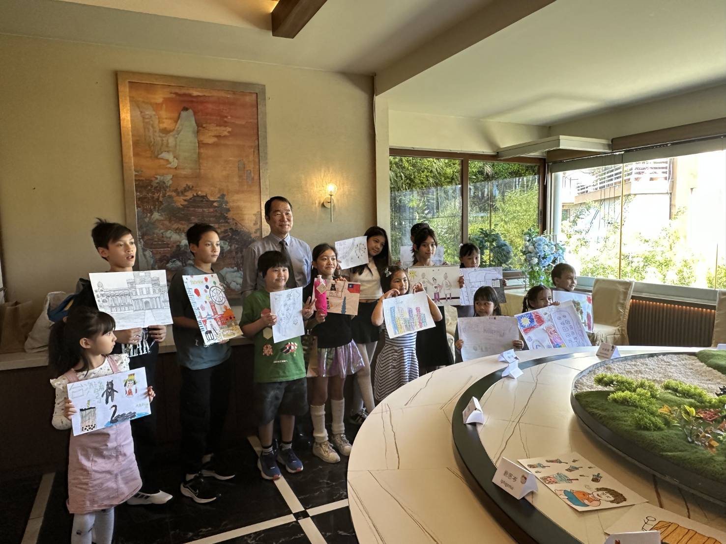 何大使與與僑胞家庭的小畫家們合影,畫中展示「我心目中的台灣」