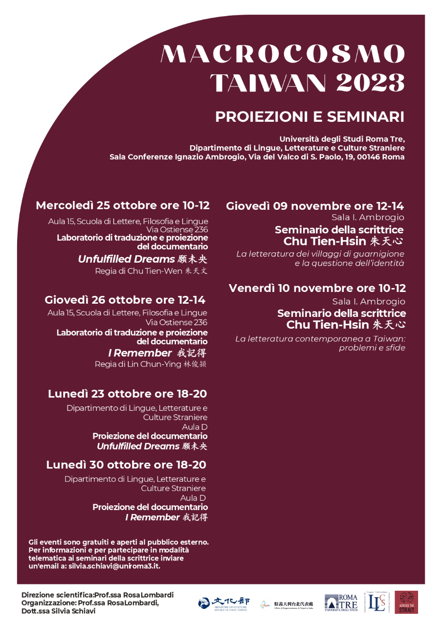 Dalla sua istituzione nell’ottobre 2020, la Divisione Culturale dell’Ufficio di Rappresentanza di Taipei in Italia ha lavorato molto alla promozione della letteratura taiwanese in contesto accademico, soprattutto grazie agli sforzi dei Dipartimenti di lingue straniere di diverse Università d’Italia. Tra questi, il Dipartimento di Lingue, Letterature e Culture Straniere LLCS dell’Università degli Studi di Roma Tre, con cui da anni la Divisione porta avanti una fruttuosa collaborazione. La Divisione è lieta di annunciare il risultato della più recente collaborazione con il Dipartimento LLCS: la terza edizione del progetto “Macrocosmo Taiwan: traduzione e produzione di adattamenti televisivi dei classici della letteratura taiwanese”. Dal 23 ottobre al 10 novembre 2023, il Dipartimento organizzerà le proiezioni di due documentari sottotitolati in italiano, due laboratori di traduzione e due incontri con la scrittrice taiwanese Chu Tien-Hsin per avvicinare gli studenti alle vicende personali e alle opere letterarie dei membri della famiglia Chu di Taiwan, Chu Hsining, Liu Musha, Chu Tian-Wen e Chu Tien-Hsin.