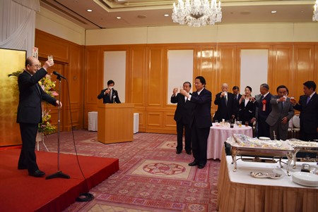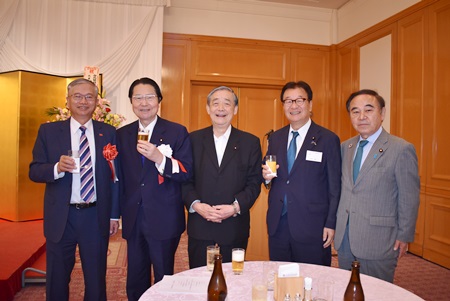 「一般財團法人台灣協會」會長清水一也(照片左1)帶領乾杯。照片右起,下村博文眾議員、坂本哲志眾議員、蔡明耀副代表、尾身朝子眾議員,隔1位後為玉澤德一郎名譽會長、衛藤征士郎會長、奧野信亮眾議員、並木正芳副會長。