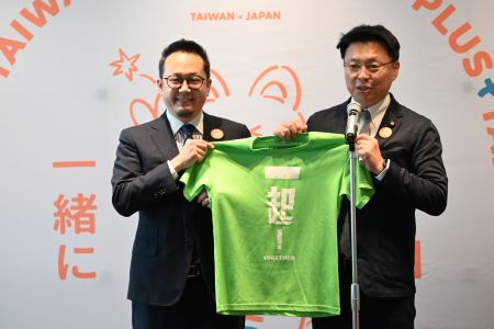 立法委員趙天麟(右)與中華文化總會秘書長李厚慶(左)宣傳今年「TAIWAN PLUS」活動主題「臺日一起」