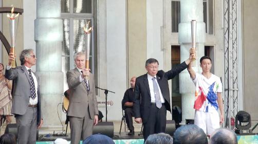 写真提供:中央社 第29回夏季ユニバーシアード台北大会を灯す聖火の採火式が20日夕方、イタリア・トリノで行われた。左よりイタリア中央大学体育運動総会トリノ分会のRicardo D'Elicio主席、国際大学スポーツ総会(FISU)のOleg Matytsin主席、柯文哲台北市長と朱木炎選手。朱木炎選手はイタリアのランナーと交代で、トリノ市内2.5キロメートルをリレーした。