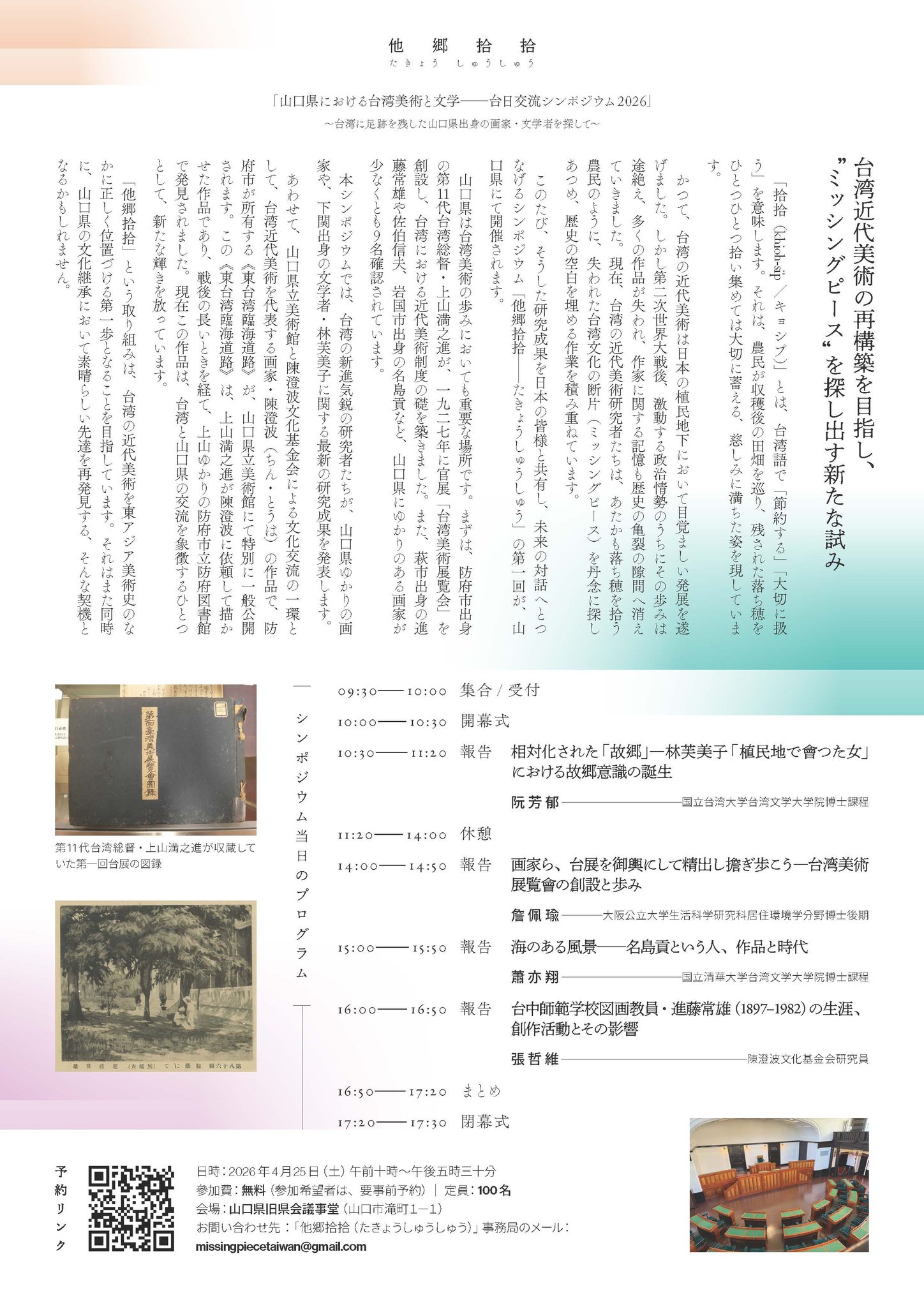 2026年4月25日(土)に山口県旧県会議事堂にて台南国家美術館準備室と陳澄波文化基金会の共催で台日交流シンポジウム「他郷拾拾 たきょうしゅうしゅう」が開催されます。