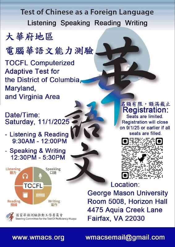 The 2025 Test of Chinese as a Foreign Language Computerized Adaptive Test (TOCFL CAT) for the District of Columbia, Maryland and Virginia (DMV) area will be held at George Mason University on Saturday, Nov. 1. Examinees who pass the test will receive a Chinese Proficiency Certificate as a credential for the following: