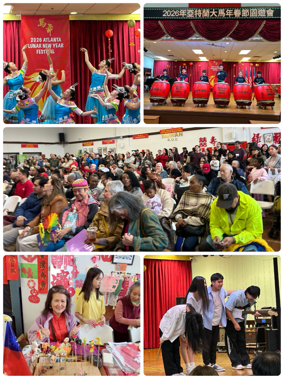 亞特蘭大春節園遊會於2月21日在亞特蘭大文教中心熱鬧登場,活動結合豐富美食、精彩表演與文化攤位,吸引約1,800名民眾踴躍參與。駐亞特蘭大辦事處處長林主恩率同仁出席,並有喬治亞州州、郡、市級民選官員及領事團到場致意,現場洋溢濃厚年節氣氛。