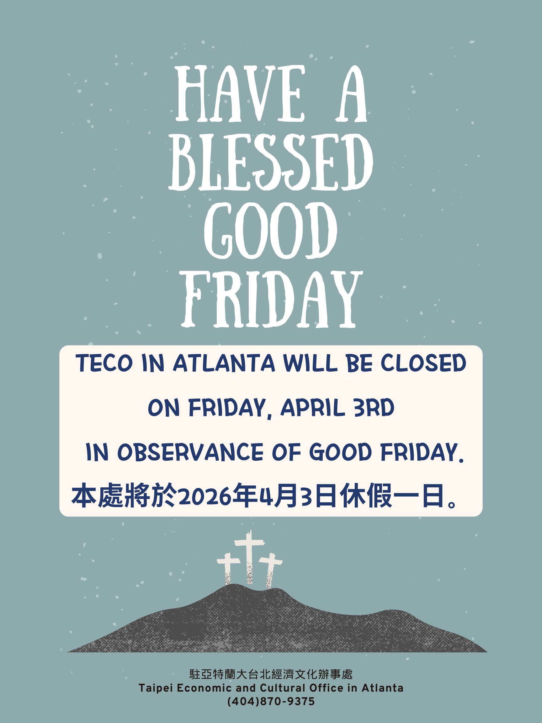 Good Friday,2026年4月3日(星期五)暫停對外服務一日。 - 駐亞特蘭大台北經濟文化辦事處 Taipei Economic and Cultural Office in Atlanta ::: 跳到主要內容區塊