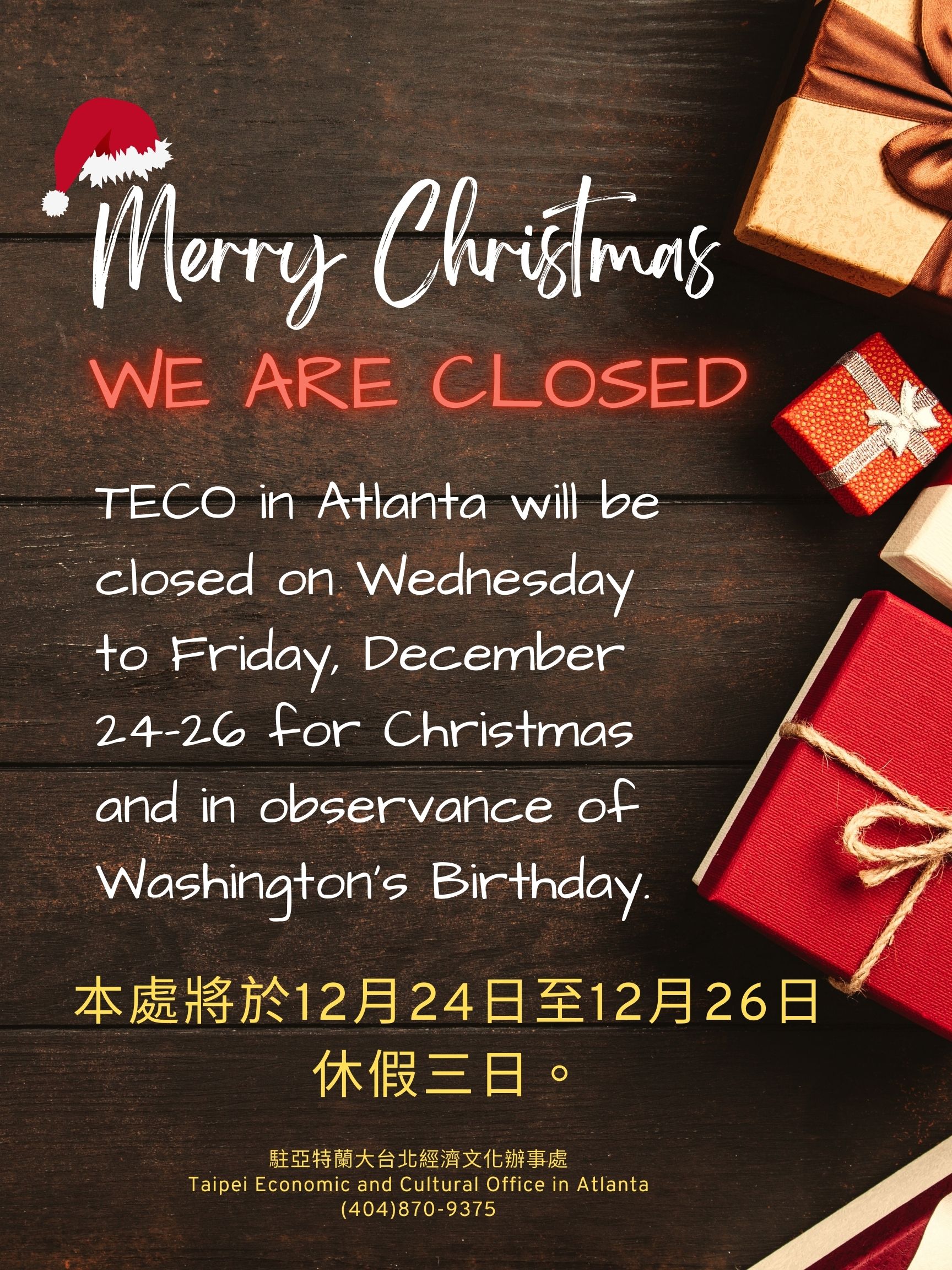 The Taipei Economic and Cultural Office (TECO) in Atlanta will be closed on Wednesday and Friday, December 24th to 26th, 2025 for Christmas Day.