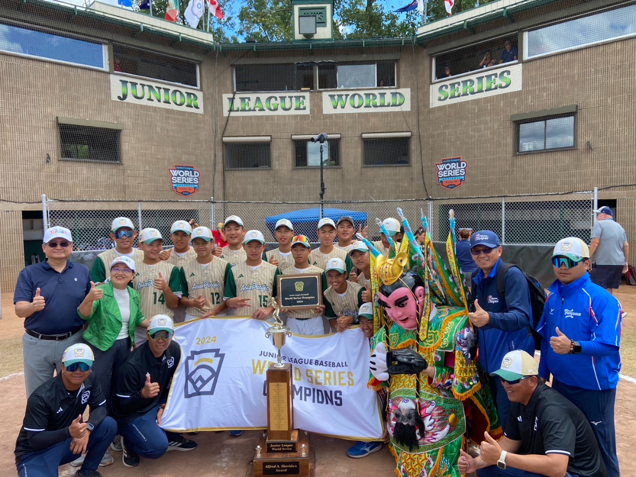 圖說:桃園新明國中隊員及教練、僑委會徐佳青委員長(左2)、駐芝加哥辦事處類延峰處長(左1)及電音三太子與冠軍獎盃合影留念。