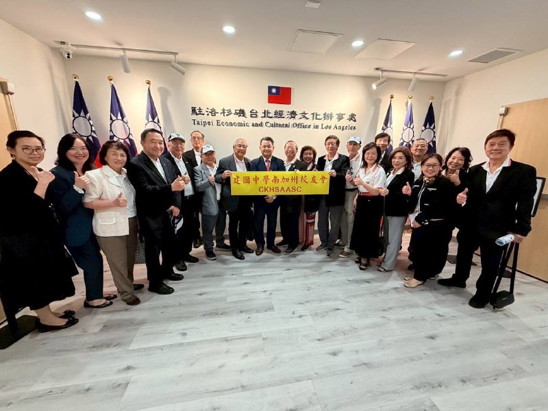 圖說1:紀欽耀處長與建中南加州校友會乙行在本處國旗打卡牆前合影。