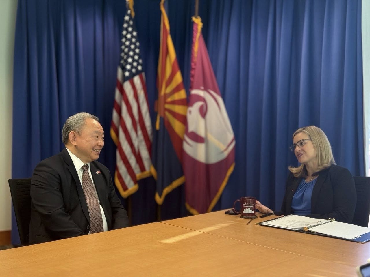 Ambassador Alexander Yui, Taiwan’s Representative to the United States, called on Phoenix Mayor Kate Gallego on December 4 to discuss economic ties, semiconductors, biotech, and future cooperation. Both sides welcomed the successful launch of China Airlines’ Taipei–Phoenix route, which strengthens travel, business, and supply-chain links. TECO-LA Director General Amino Chi joined in the conversation.