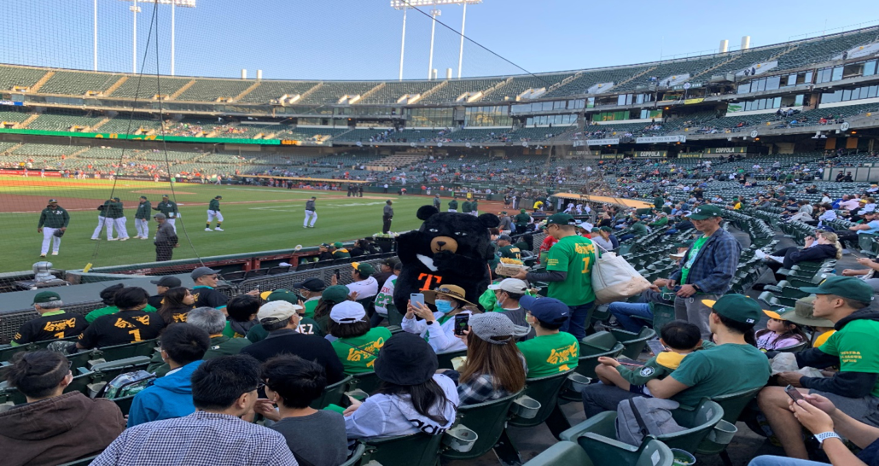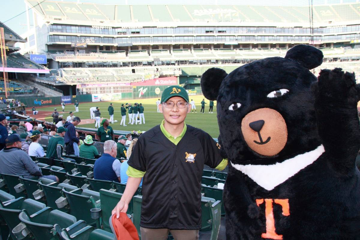 台鄉僑團首度舉辦MLB奧克蘭運動家隊「台灣日」, 並邀請賴處長為比賽開球 賴處長在台灣喔熊助陣下,為台美關係開出一記好球! 參加的僑胞除了隨票附贈有「台灣日」字樣的紀念球衣,比賽前有購票的球迷並可在停車場參加「Tailgate BBQ」賽前派對,