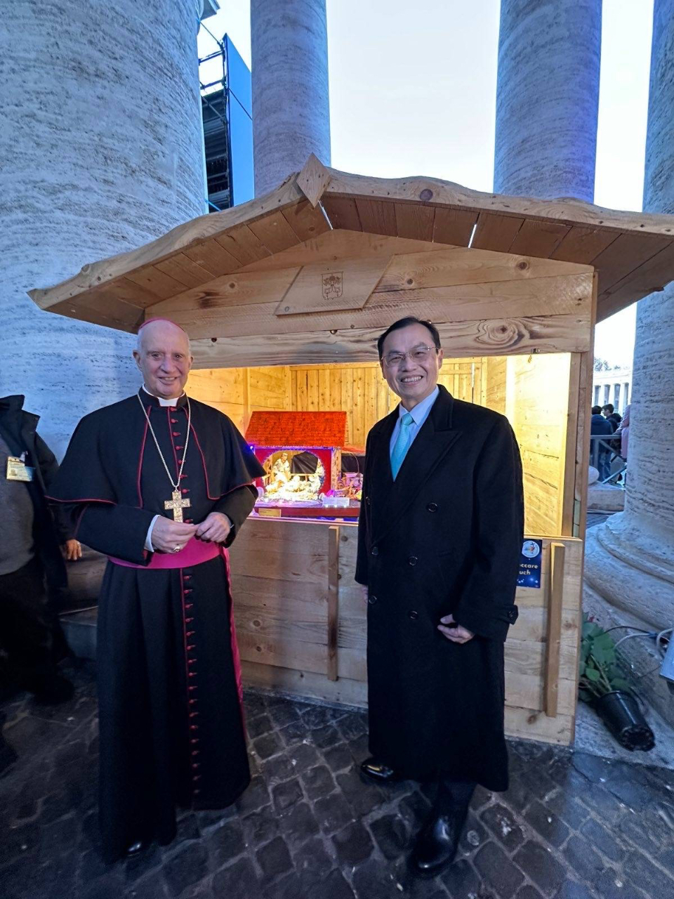 開幕剪綵後,賀大使向Fisichella總主教致意,並為他介紹台灣馬槽作品;F總主教興致盎然欣賞我國馬槽作品,並感謝台灣教區始終全力支持旨活動,年年參與之熱情可感。