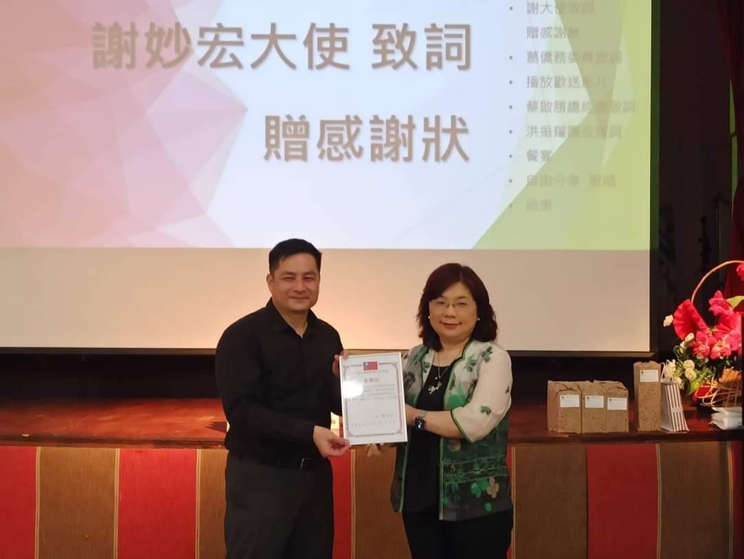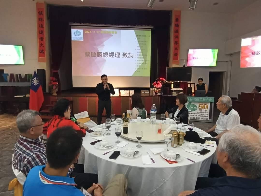 阿根廷台灣僑民聯合會於本(113)年11月2日舉辦「歡送離任長榮海運阿根廷分公司蔡啟勝總經理,及歡迎抵阿參賽台灣橋牌國手隊聯歡餐會」,本處謝大使妙宏偕駐處同仁出席,除致贈蔡總經理啟勝感謝狀,並與僑民鄉親共同為來阿根廷參加「第16屆世界橋牌大賽」台灣國手加油,爭取佳績。