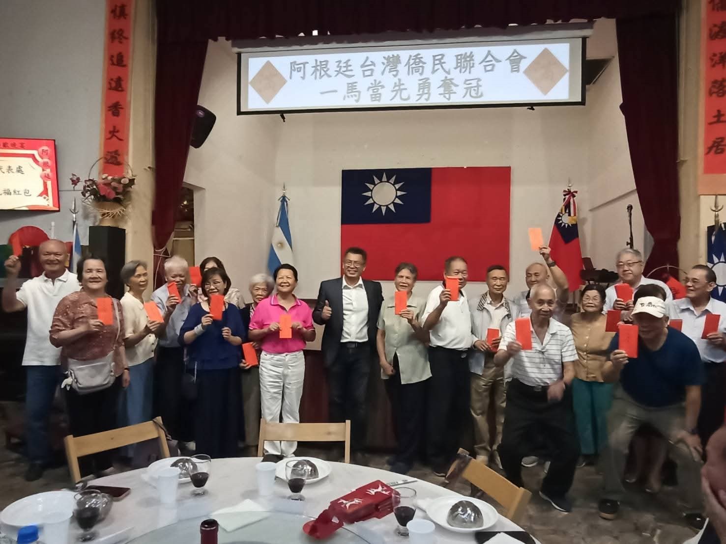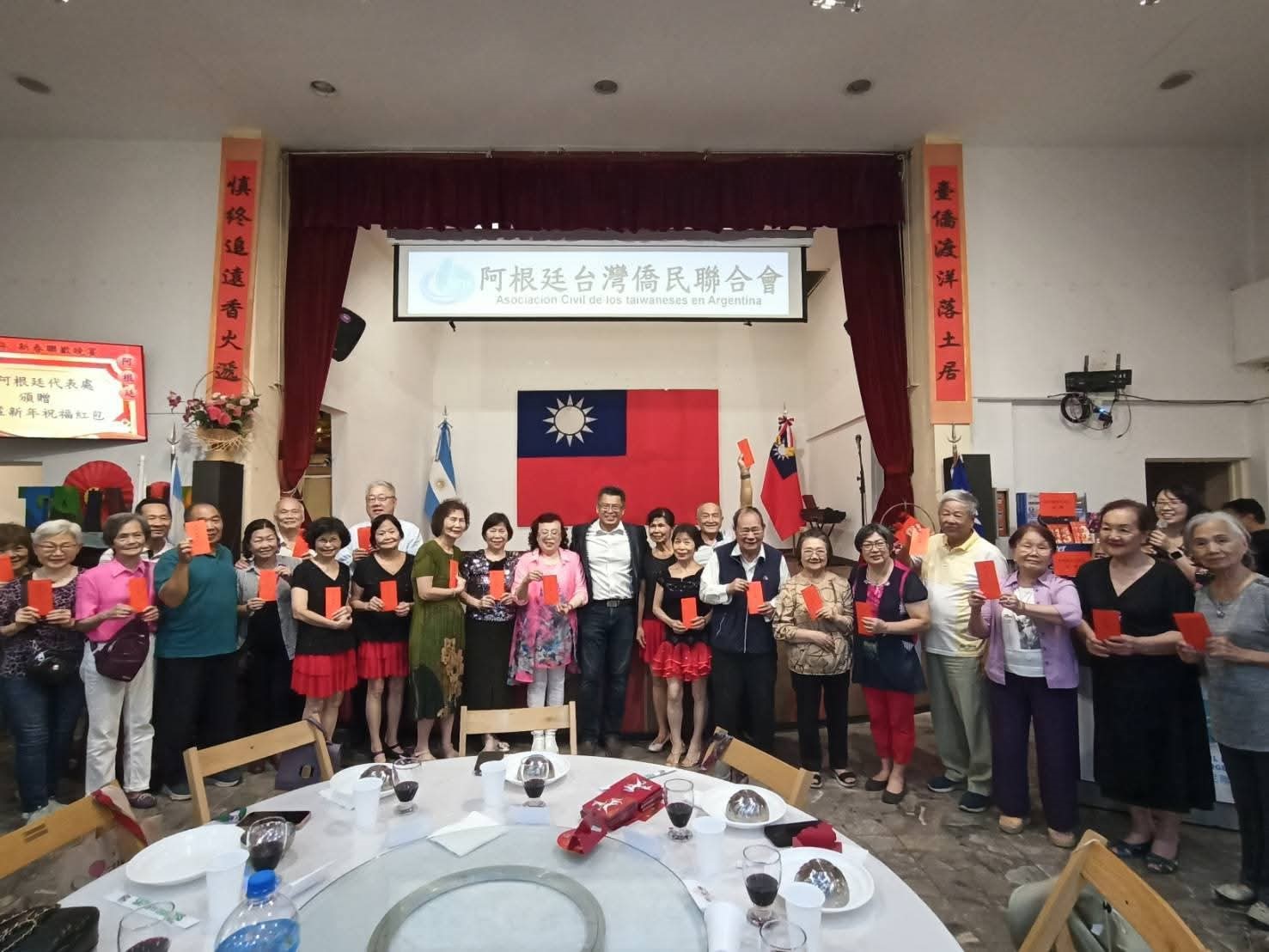 阿根廷台灣僑民聯合會於本(115)年2月22日舉辦「2026年春節晚宴」活動,本處同仁暨眷屬應邀出席,惠副參事卓岳並代謝大使妙宏發贈新春紅包給年長長輩,祝福大家新年快樂!