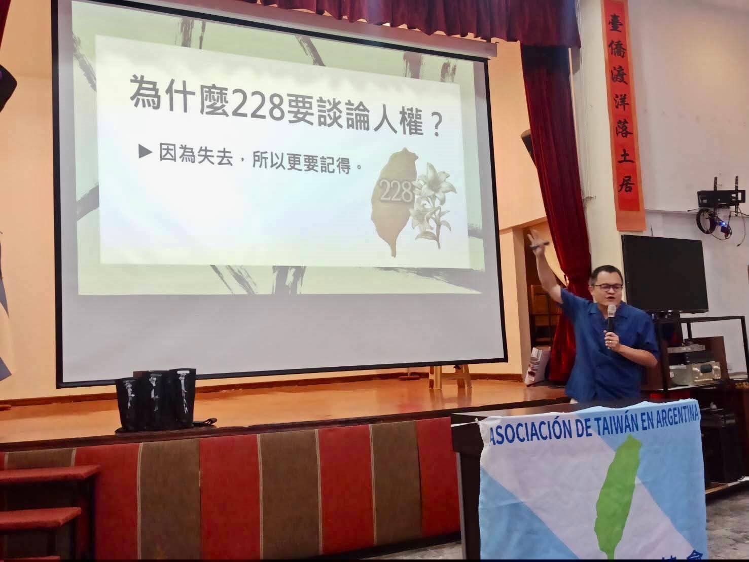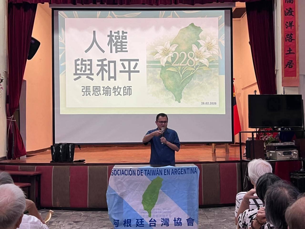 阿根廷臺灣協會於本(115)年2月28日舉辦「紀念二二八事件人權講座」活動,邀請阿根廷福音教會張牧師恩瑜主講「人權與和平」。本處惠副參事卓岳代表謝大使妙宏應邀出席,與旅阿僑民鄉親透過人權座談緬懷歷史,並盼將歷史的經驗化為前進的力量,讓臺灣成為一個更民主、自由與包容的社會。