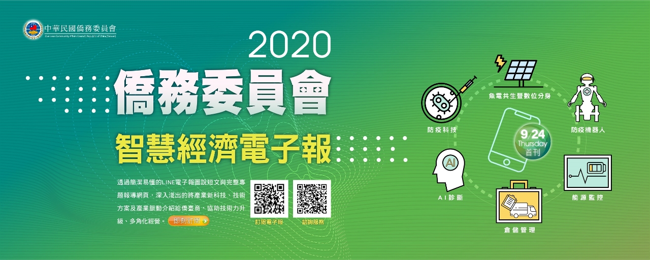 面對新冠肺炎(COVID-19)後疫情時代經濟局勢,僑委會童委員長關心海外僑臺商事業發展,整合臺灣產官學研資源,推出一系列疫後振興措施,本年首度以「智慧經濟」為主軸之創新業務,包括:資訊提供、諮詢服務、產學媒合及顧問指導等整合性服務,每週四發行1期〈智慧經濟電子報〉,且採中英文雙語方式呈現,協助不同世代的僑臺商朋友都可定期獲得重要產業資訊,應對危機與企業轉型。歡迎大家訂閱!各期主題內容如下(原則每週四發行):
