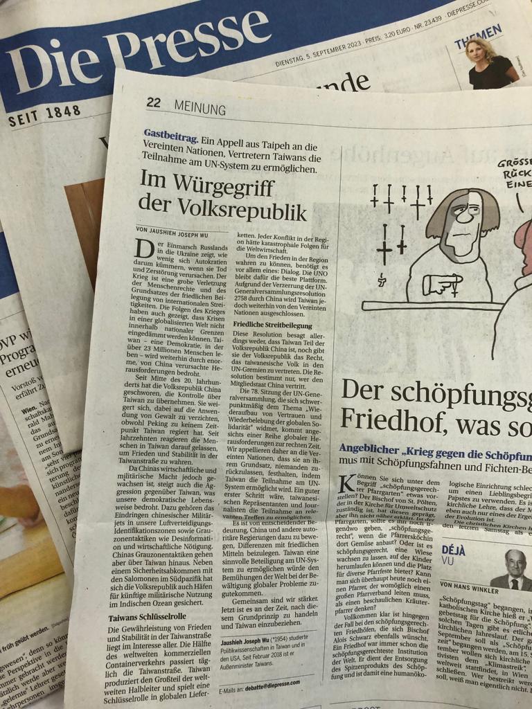 奧地利主流德文日報「新聞報」(Die Presse)於9月5日刊登外交部部長吳釗燮有關今年台灣推動參與聯合國(UN)案之專文,呼籲國際社會應力抗外來壓力,歡迎臺灣參與聯合國,以在民主世界面對挑戰時釋出重要團結訊號。