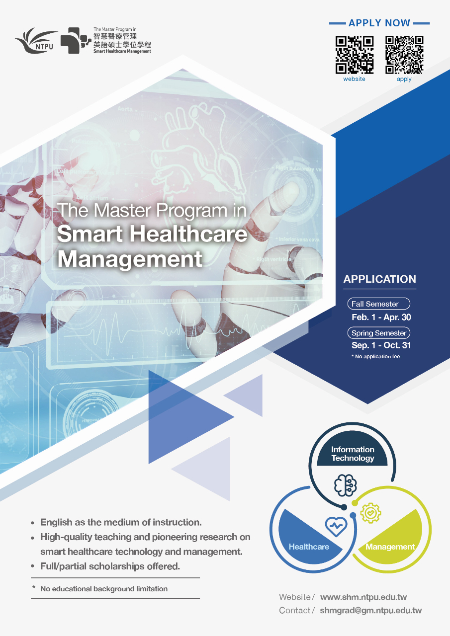 The Master Program in Smart Healthcare Management in International College of Sustainability Innovations at National Taipei University in Taiwan (R.O.C.) is an innovative graduate program focusing on cross-field research and teaching. The program combines 3 fields of study: information technology, healthcare, and management to create a digitized healthcare system and connect available medical resources and healthcare services.
