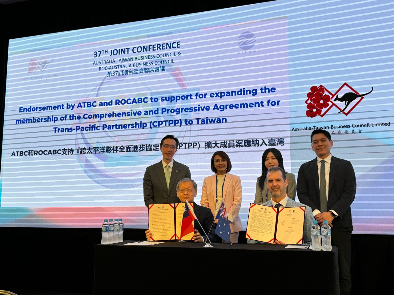 ATBC及國經協會澳洲委員會在會中共同推動支持CPTPP擴大成員案納入台灣,徐大使及立委邱議瑩、李柏毅、吳沛憶見證王主任委員與ATBC主席John Toigo簽署聲明,期盼雙方在CPTPP架構下實現互惠互利。