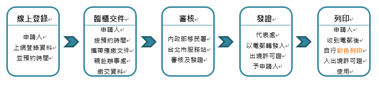 2.預約時間以線上系統可預約時間為準,本處將依預約時間依序審核,無法提前辦理。 3. 申請並不保證會通過審核發證,請務必於收到入臺證後再行預訂機票及酒店。 4. 若預先購買機票並因延誤造成損失,申請人須自行承擔。 5. 若未先於線上登錄資料並預約,或照片不符合規格,本處將不予受理。 6. 此入臺證僅能從事觀光相關活動,嚴禁用於從事商務、學術交流、宗教行為等其他事由。 7. 此入臺證僅能由第三地入境台灣,如欲從中國大陸來臺,請另洽中國大陸當局申請『中國大陸人民往來臺灣通行證』。 |