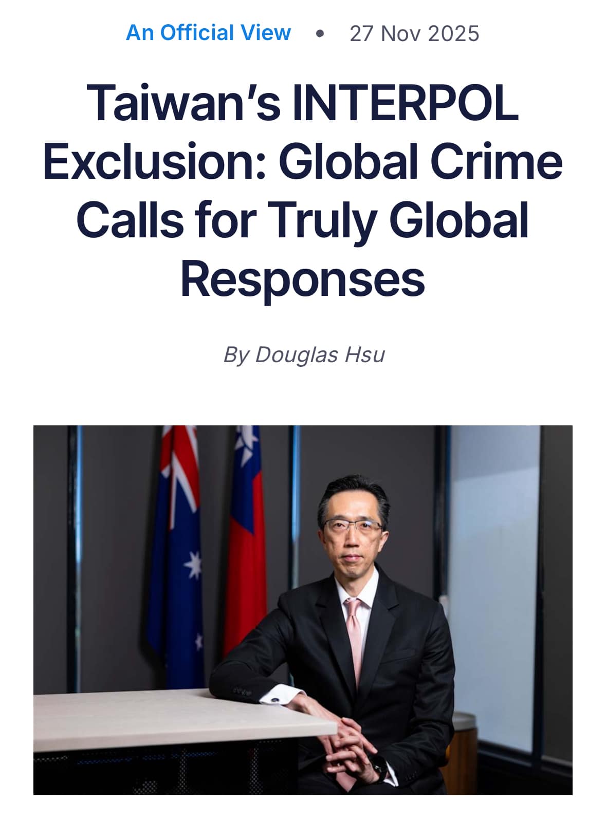 駐澳大利亞代表處徐佑典大使11月27日投書澳洲國際事務媒體「澳洲展望」(Australian Outlook),呼籲各界全力支持台灣以觀察員身份加入「國際刑警組織」(INTERPOL)。徐大使指出,跨境詐欺、洗錢、人口販運等犯罪早已無視國界,且持續加速升級及數位化。台灣卻被排除在INTERPOL情資系統之外,造成全球安全網出現明顯漏洞。