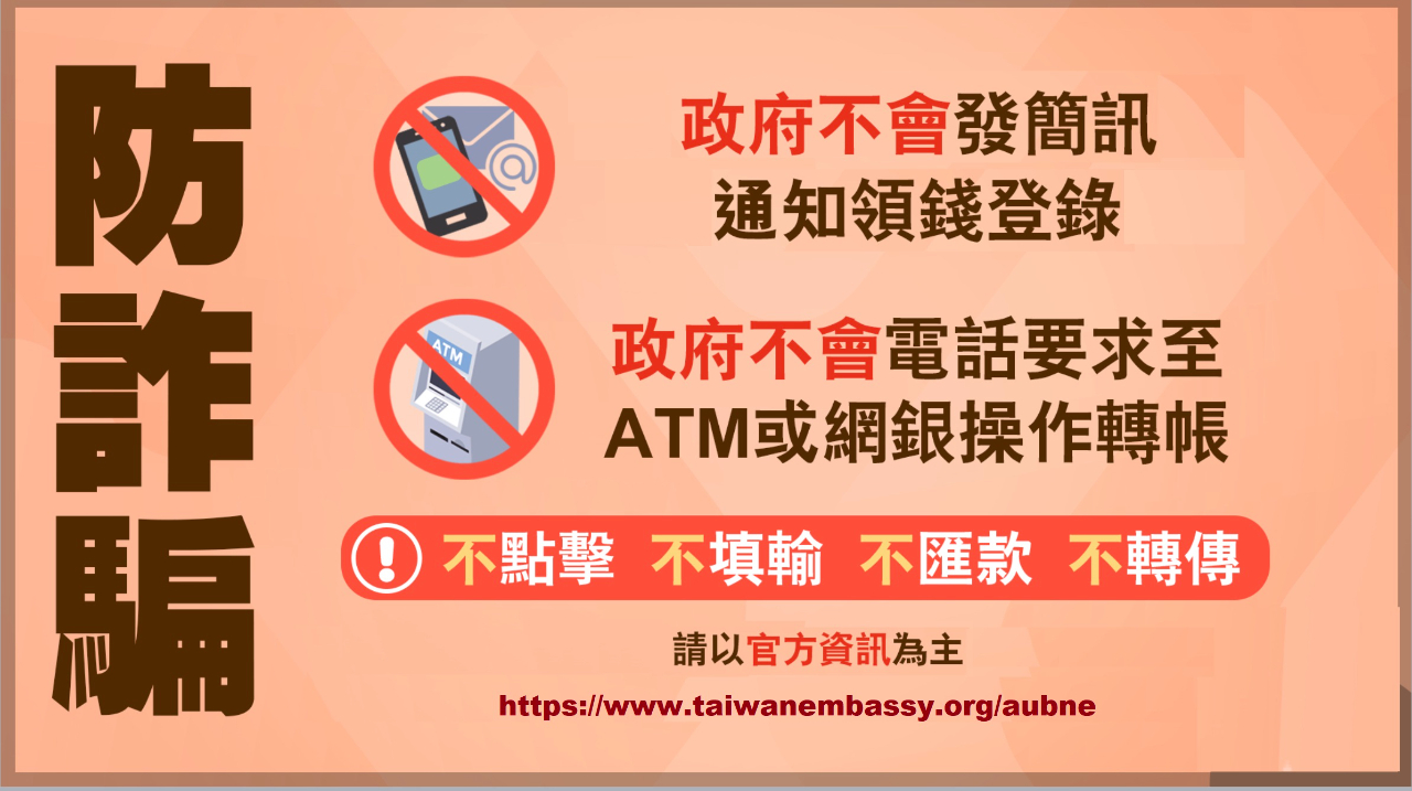 「反詐騙三部曲」:一聽、二掛、三查證 1. 一聽:不要回撥只響一聲之來電,看清楚來電號碼,聽到匯款即提高戒心。 2. 二掛:聽到可疑電話,立刻掛斷,不讓歹徒繼續操控你的情緒。 3. 三查證:請您報案或查證,並直接向您當地警局報案,或電郵本處信箱: bne2@mofa.gov.tw 查證。
