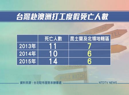 來澳打工度假的臺灣青年最高峰曾經達到每年三萬六千人,最近雖有下降,但仍有二萬多人,根據臺灣外交部統計,最近三年,平均每年都有超過十多人因車禍、游泳溺斃意外事故死亡,令人憂心。