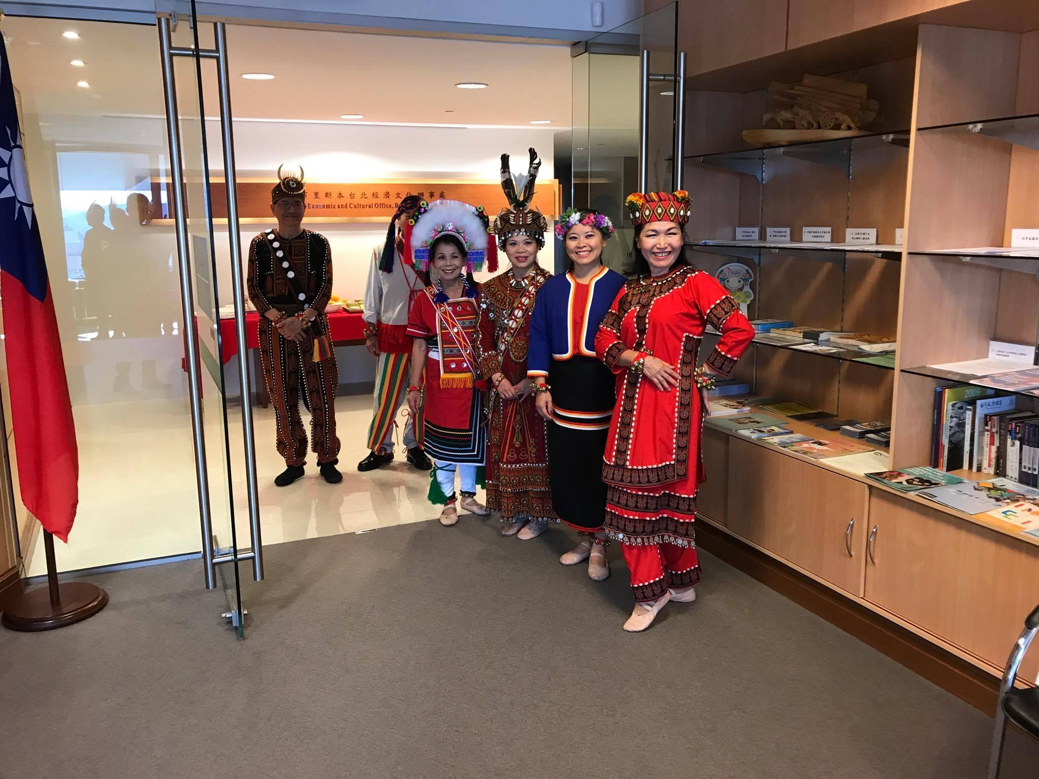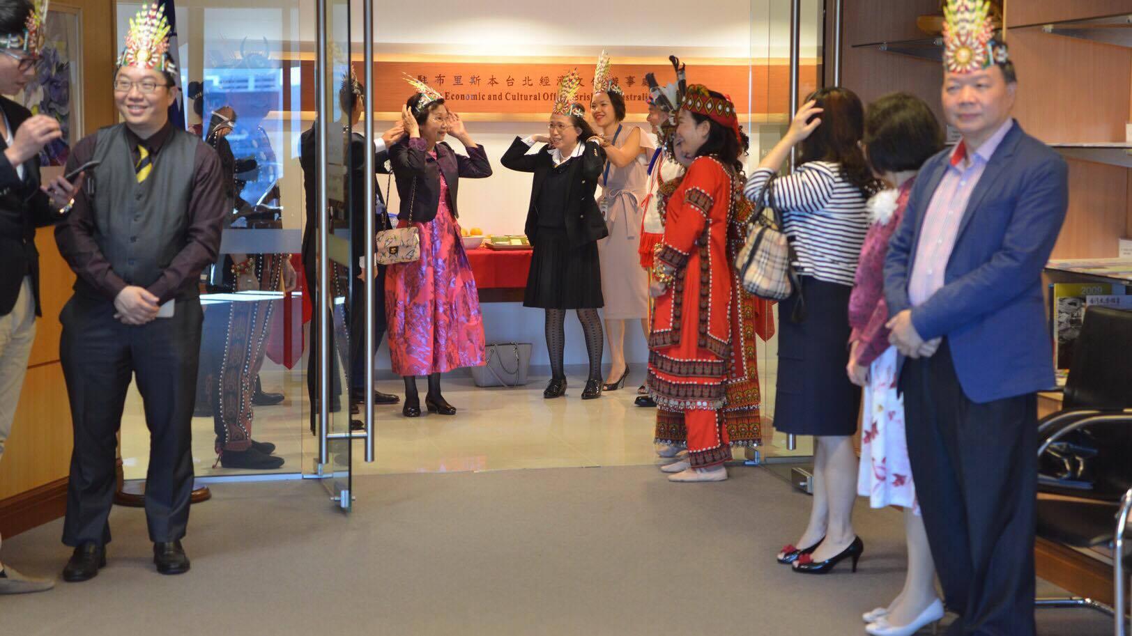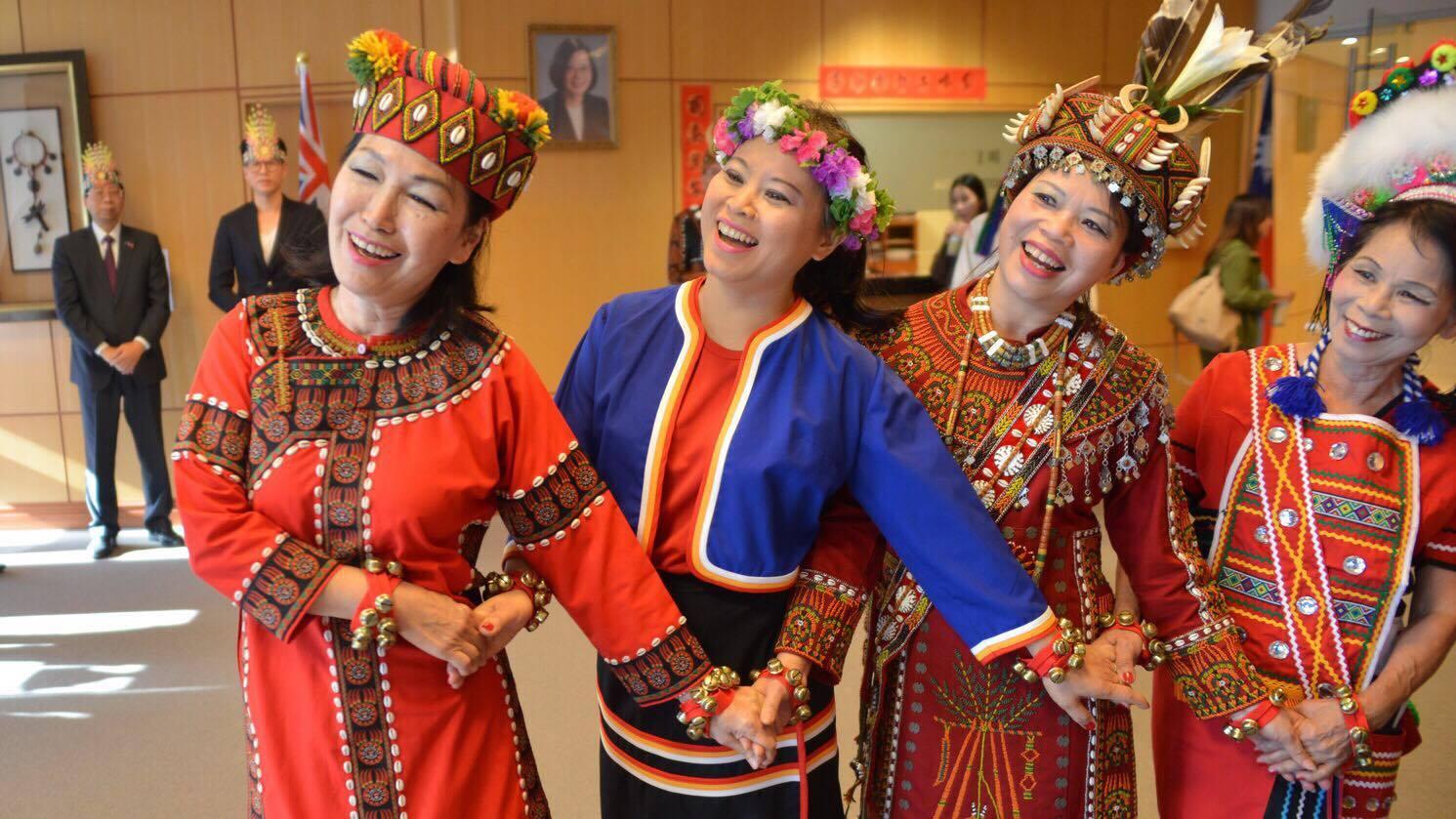台灣舞蹈團身穿台灣原住民服裝迎賓