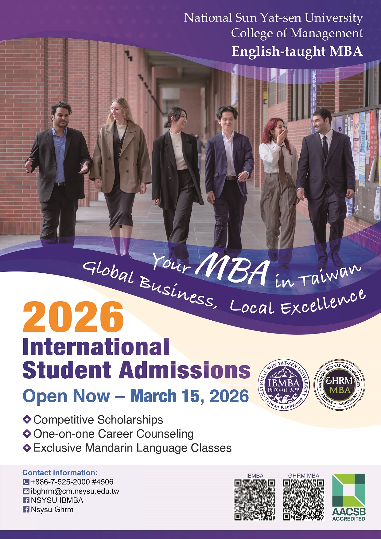 國立中山大學管理學院 115 學年度全英語授課學士及碩士學位學程,即日起開始招收外籍學生,相關資訊如下: