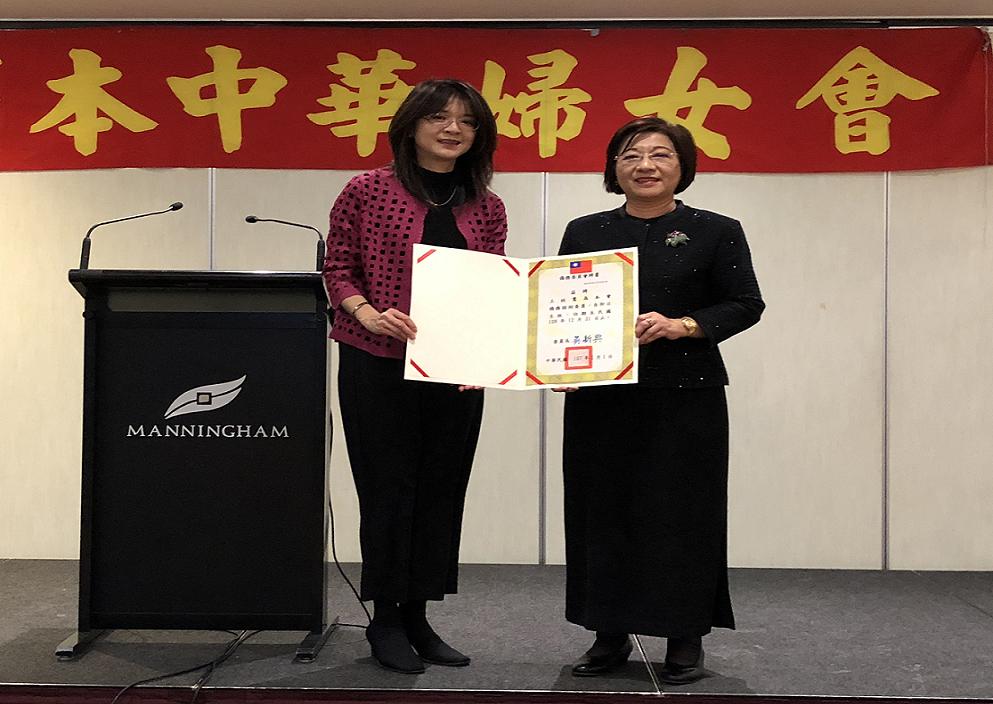 會中並由陳處長代表僑務委員會吳委員長新興頒發王桂鶯女士續任僑務諮詢委員聘書;陳處長另受邀與華僑救國聯合總會墨爾本辦事處主任王桂鶯共同頒發獲得華僑救國聯合總會海外優秀青年獎林純立先生獎章及獎狀。