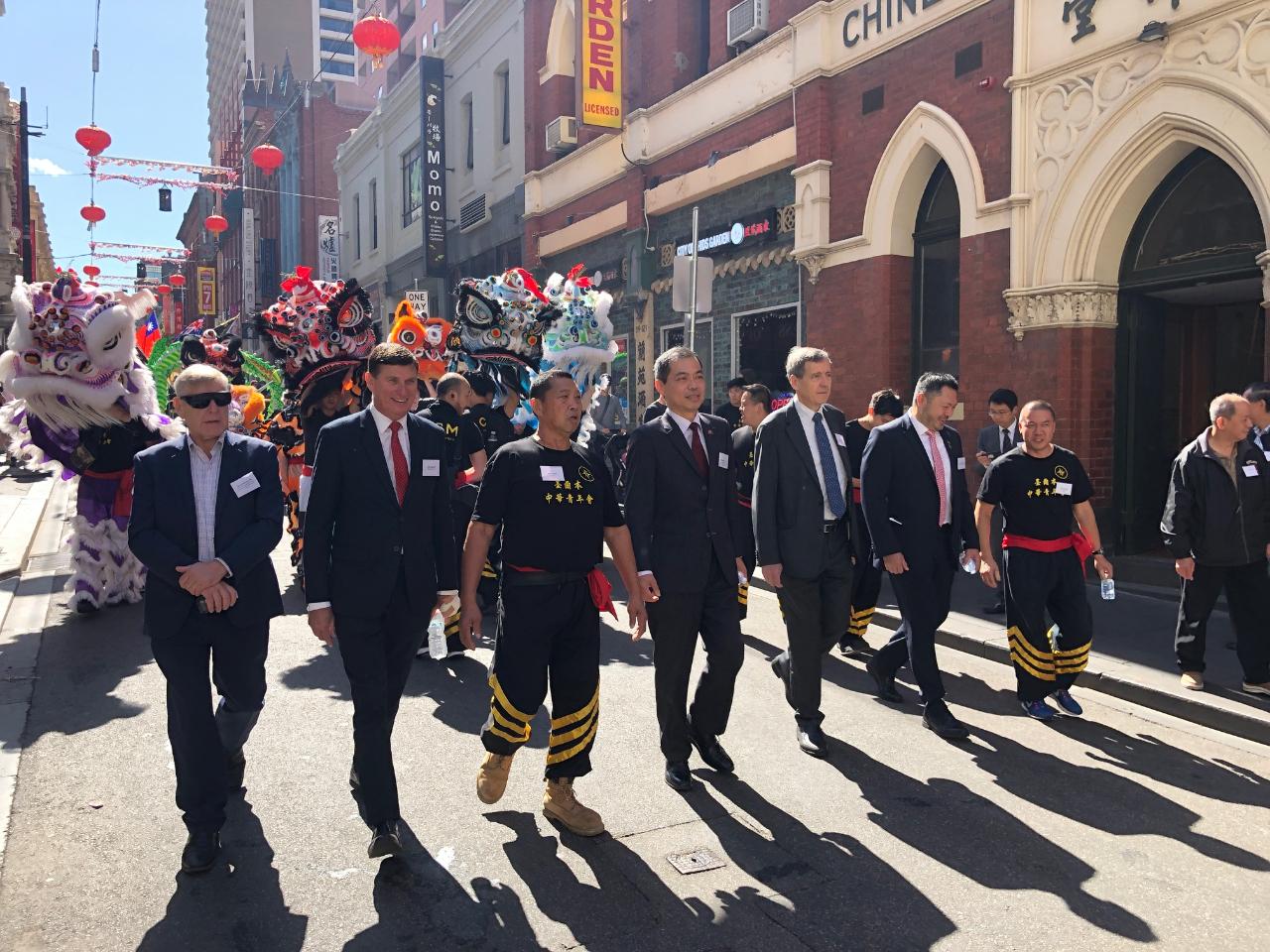 墨爾本中華青年會本(109)年2月2日大年初九上午在墨爾本唐人街封街舉辦2020年新春醒獅舞龍賀歲活動,本處處長林起文偕同仁應邀出席。維州參議員Hon. Bruce Atkinson、維州議會友臺小組共同主席Neil Angus、自由黨主席Robert Clark、白馬(Whitehorse)市市議員Tina Liu、萬年興(Manningham)市市議員Anna Chen、僑務諮詢委員吳天佐、王桂鶯、劉國強、僑務促進委員姜為開及江秀琴等僑領及僑胞共襄盛舉。