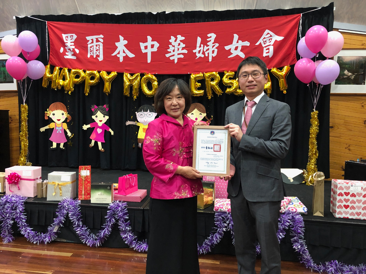 「墨爾本中華婦女會」5月2日在Box Hill Art Centre舉辦慶祝2021年母親節活動,駐墨爾本臺北經濟文化辦事處王偉年副組長、李函秘書及康雅雄僑務秘書應邀出席。榮譽會長王桂鶯、會長郝家蘭、僑務顧問錢培瑤、楊瑾玲、僑務促進委員江秀琴、「墨爾本臺灣商會」會長葉如芳、「墨爾本客家聯誼會」會長張展智伉儷、「澳洲維省庸社詩書畫會」榮譽會長蘇華響伉儷、婦女會理監事及會員共約60人參加。