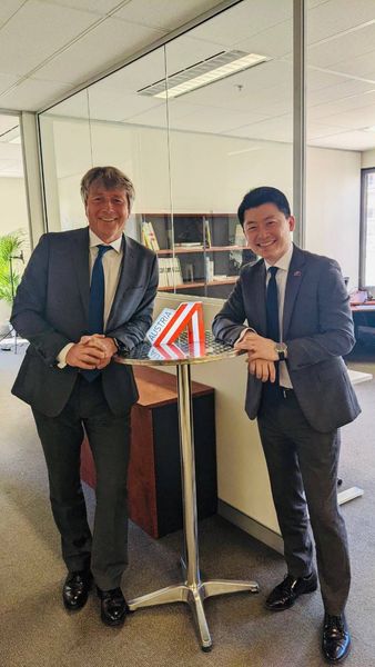 吳正偉處長與同仁今天至奧地利駐雪梨總領事館會晤Karl Hartleb總領事兼貿易代表(駐雪梨領事團團長),雙方就台奧近期互動、雙邊投資貿易、人權維護及俄烏戰爭等議題交流,氣氛熱絡。吳處長期待雙方未來能持續互動,使台奧合作能進一步深化。