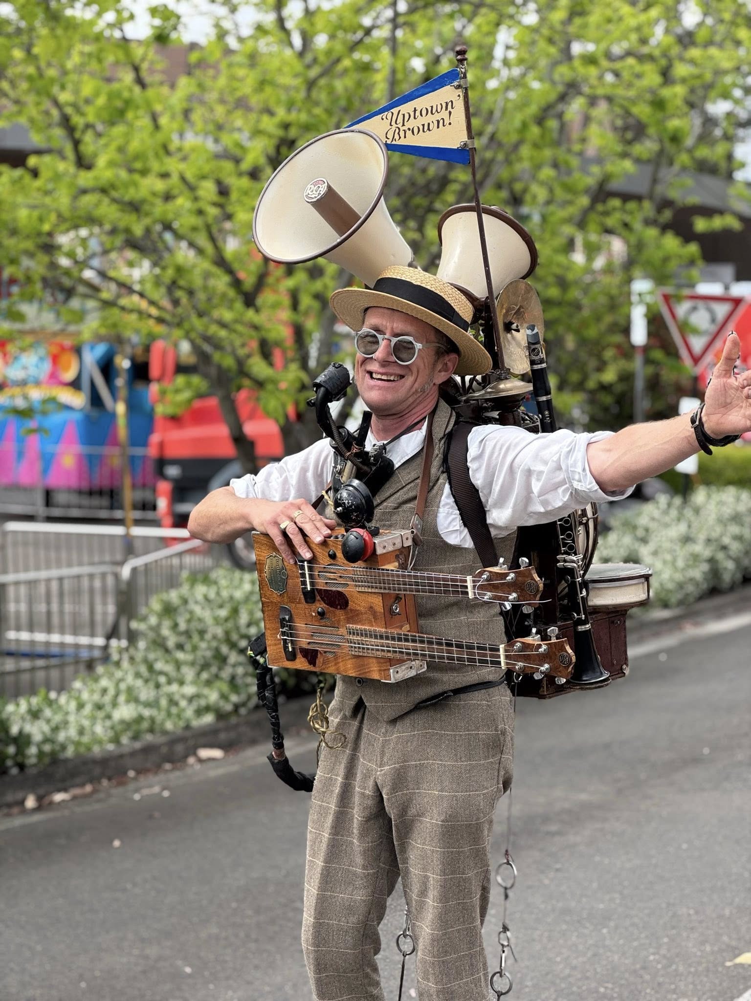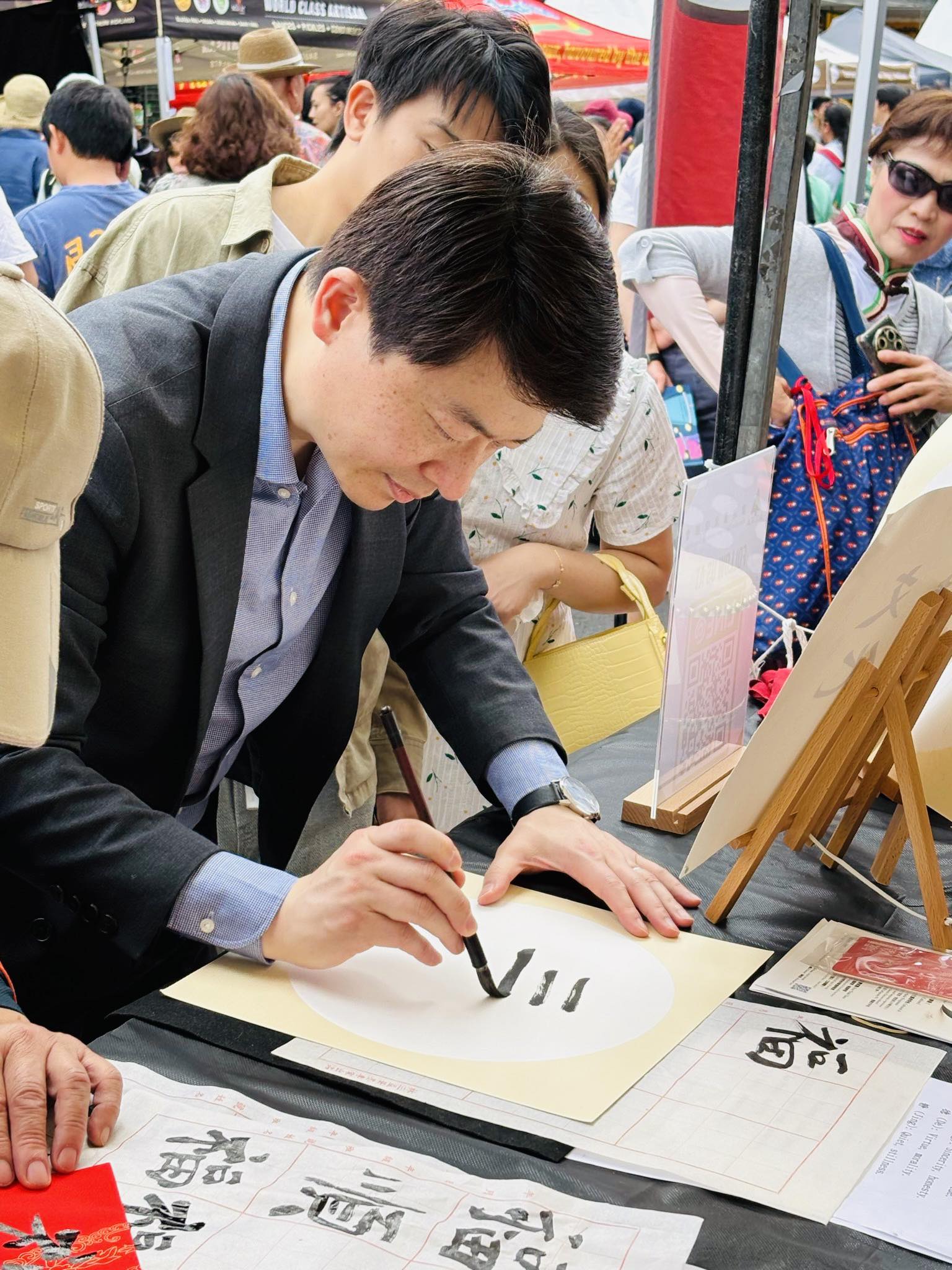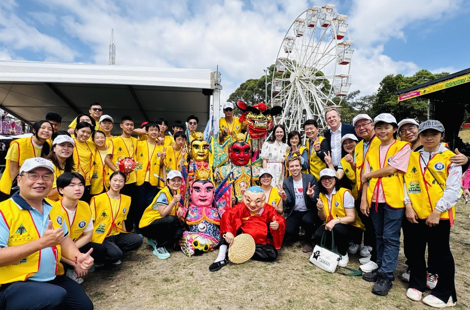 台僑社群當然沒有缺席;澳洲臺灣同鄉會(ATFA)特別設置文化體驗攤位讓民眾現場揮毫,吸引吳處長提筆迎春;澳洲新南威爾斯國際傑人會(DCS NSW, Australia)也與海外青年文化大使(FASCA)雪梨分會合作,出動電音三太子、舞獅及笑面佛參與遊行,展現台灣獨特傳統文化,Minns州長亦特別與團隊合影留念。