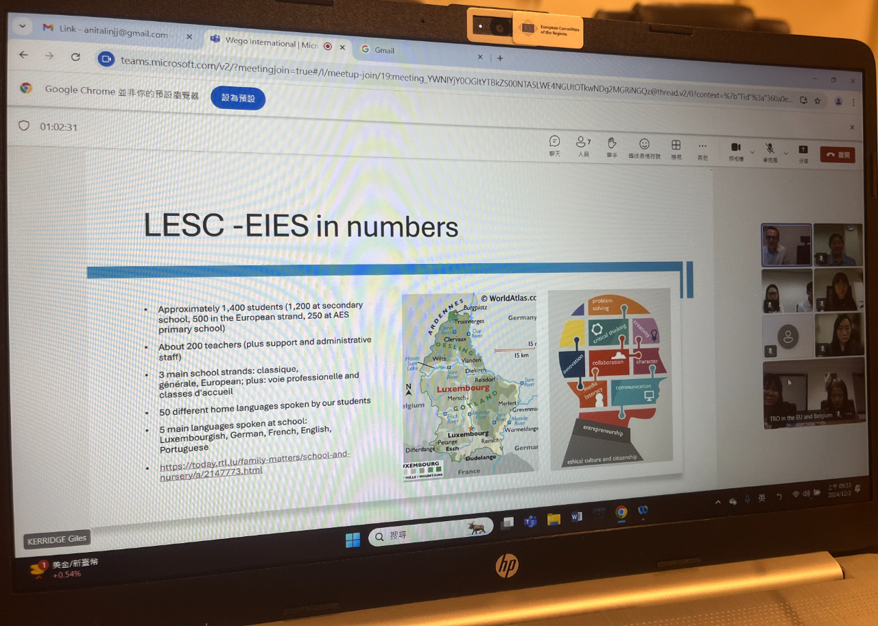 本處李淳大使於6月27日參訪盧森堡愛德華史泰欽國際學校,並會晤校長Max Wolff,該校表示樂願與我學校進行交流合作,本處於12月2日成功媒合該校與我國薇閣國際學校舉行線上會議。 愛德華史泰欽國際學校為位於盧森堡北部克萊沃市的公立學校,不收取學費,並提供多語(英文、法文、德文等)及多元文化教育,也是盧國第一所為每位學生提供一台平板電腦(iPad)的中學。該校設有幼稚園、小學、中學,致力培養學生21世紀能力。 薇閣國際學校秉持「中西並用,走向世界,也讓世界走進來」的教學宗旨,以全人教育、多元化教學設計及國際課程為其特色,提供幼兒園、小學及中學課程,並於陽明山設立田園教學中心,讓學生體驗大自然,畢業生多考取國內外知名大學。 上述2校透過線上互動,同意未來進行雙邊教職員互訪、學生交換及小規模計畫合作如e姊妹校及手做空間計畫,並以語言及科學、技術、工程及數學教育(STEM)為主要合作領域。雙方交流熱絡,期待未來更多合作機會。