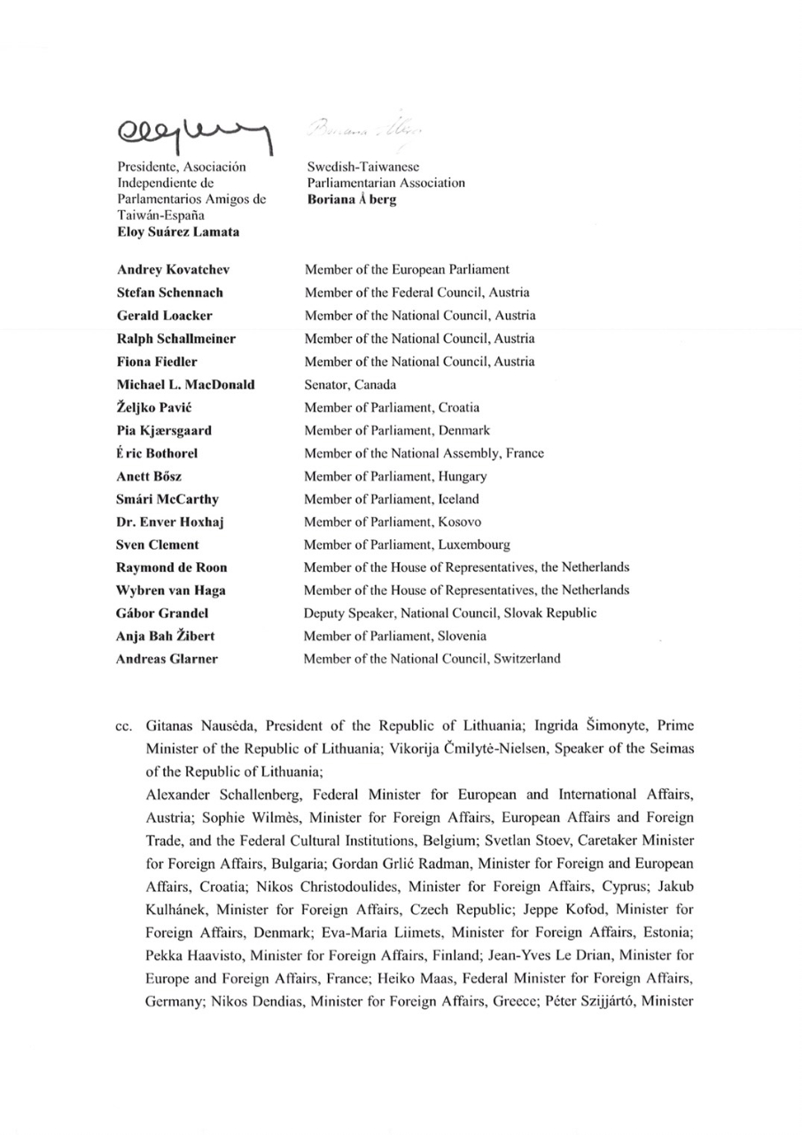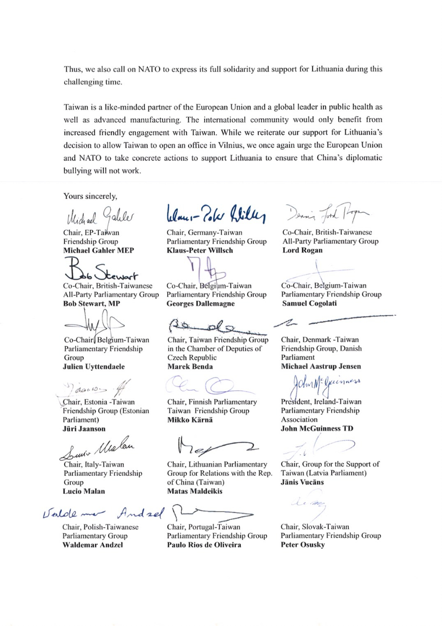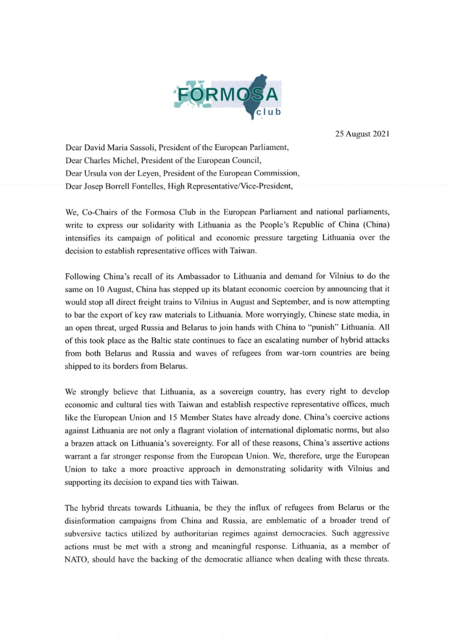 We sincerely appreciate that the Co-Chairs and members of the Formosa Club co-signed a joint letter addressed to Charles Michel, President of the European Council; Ursula von der Leyen, President of the European Commission; David Maria Sassoli, President of the European Parliament; and Jens Stoltenberg, Secretary General of the North Atlantic Treaty Organization, urging the European Union and NATO to take concrete actions to demonstrate solidarity with Lithuania and support its decision to expand ties with Taiwan.