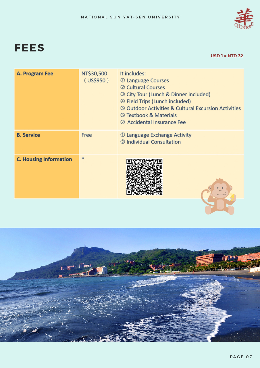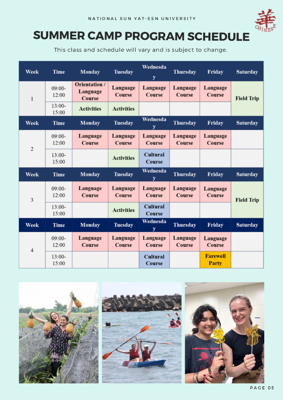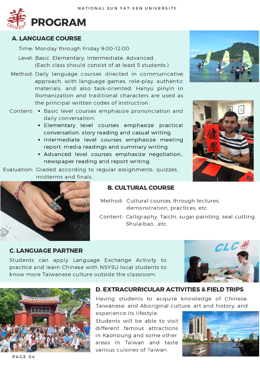 Throughout 4 weeks Mandarin learners can enjoy language courses at their level, while also participating in cultural courses such as calligraphy, Taichi, seal cutting, etc. During the weekends participants get to discover Taiwan's beauty and cuisine, going on field trips to different famous attractions.