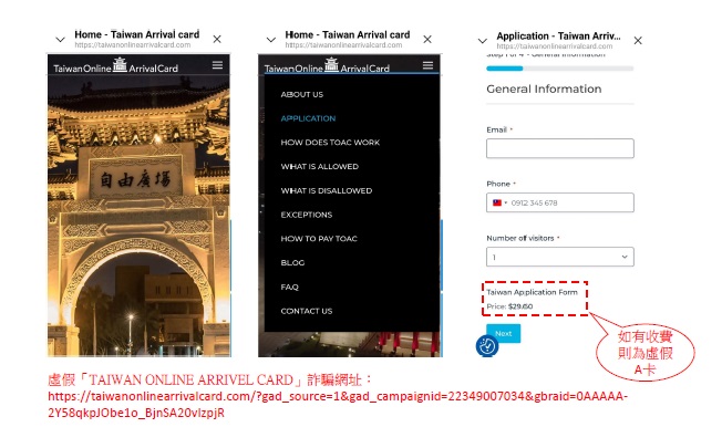 Members of the public have reported fraudulent websites impersonating the official "Taiwan Arrival Card" (TWAC) system—such as the site named “TAIWAN ONLINE ARRIVAL CARD”—which charge users approximately USD 29.60 or other fees under the pretense of assisting with entry registration. These scams may lead to personal data breaches and financial loss.