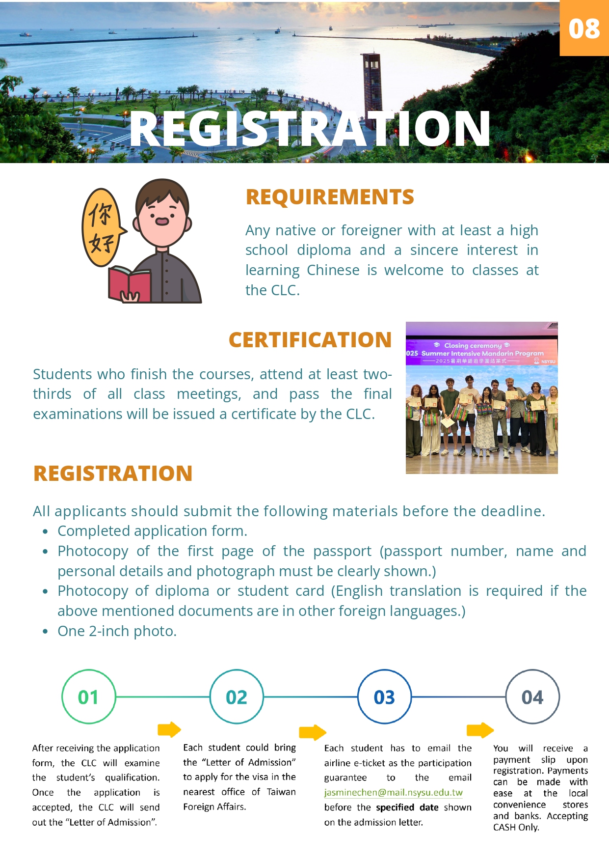 In order to apply for program participation, please fill in the application form and send it to jasminechen@mail.nsysu.edu.tw and kellyvandepaer@mail.moe.gov.tw, including a copy of your ID or passport and a proof of enrollment at a higher education institution in the Benelux region.
