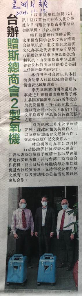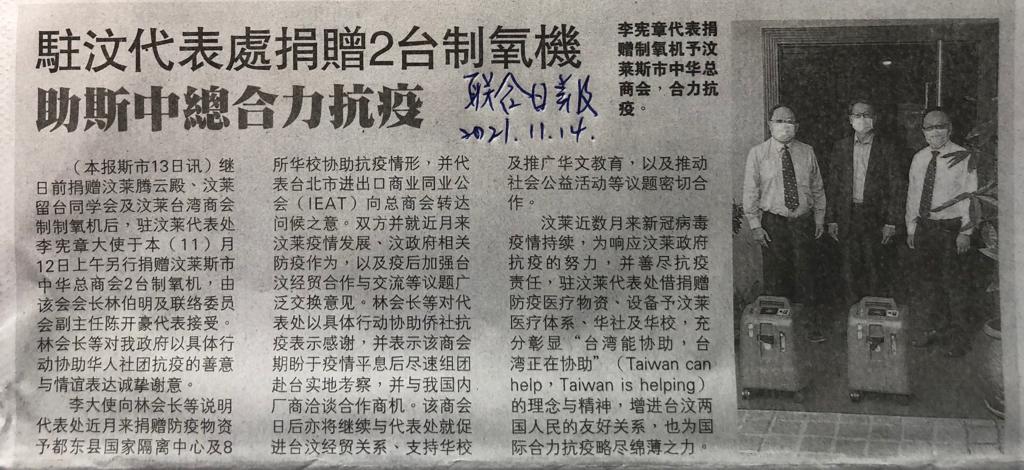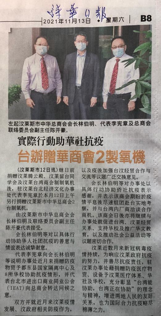 繼日前捐贈汶萊騰雲殿、汶萊留台同學會及汶萊台灣商會製製氧機後,駐汶萊代表處李憲章大使於本(11)月12日上午另行捐贈汶萊斯市中華總商會2台製氧機,由該會林會長伯明及聯絡委員會陳副主任開豪代表接受。林會長等對我政府以具體行動協助華人社團抗疫的善意與情誼表達誠摯謝意。