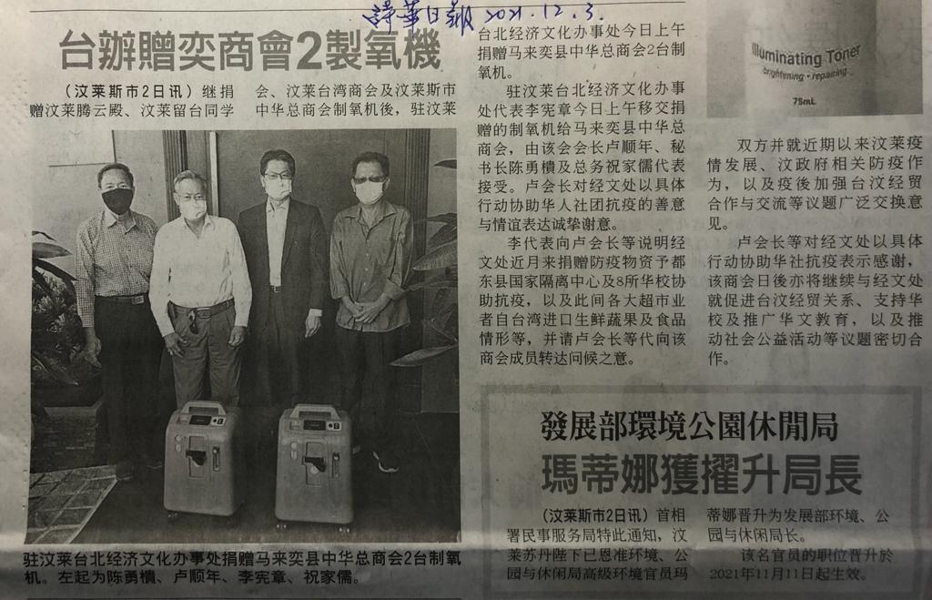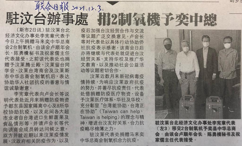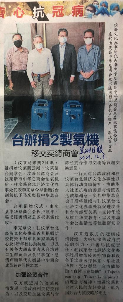 繼捐贈汶萊騰雲殿、汶萊留台同學會、汶萊台灣商會及汶萊斯市中華總商會製氧機後,駐汶萊代表處李憲章大使於本(12)月2日上午捐贈馬來奕中華總商會2台製氧機,由該會盧順年會長、陳勇樻秘書及祝家儒主任代表接受。盧會長等對我政府以具體行動協助華人社團抗疫的善意與情誼表達誠摯謝意。