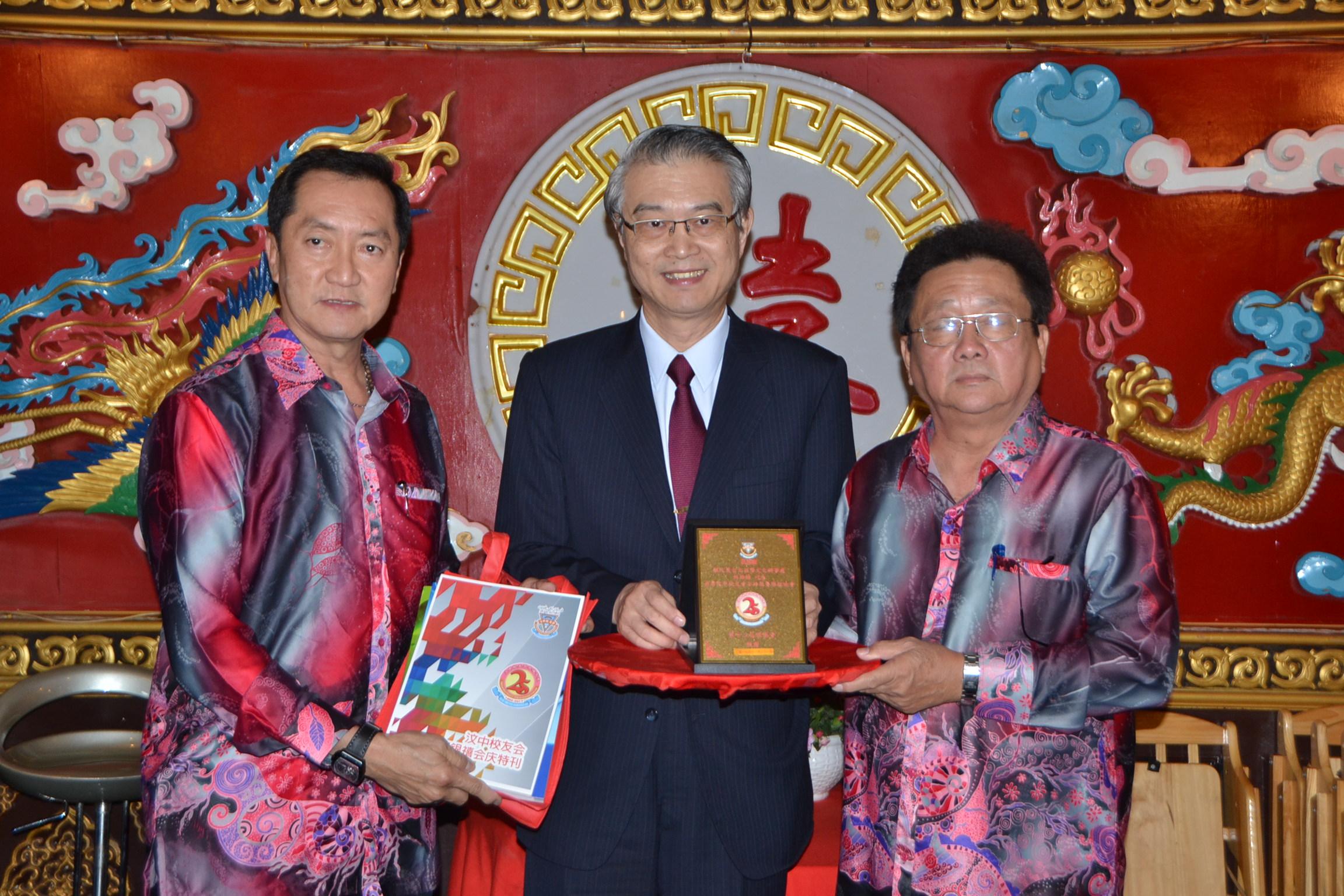 汶中校友會主席陳源祥(右)、署理主席程永年(左)致贈紀念狀予駐汶萊代表林維揚