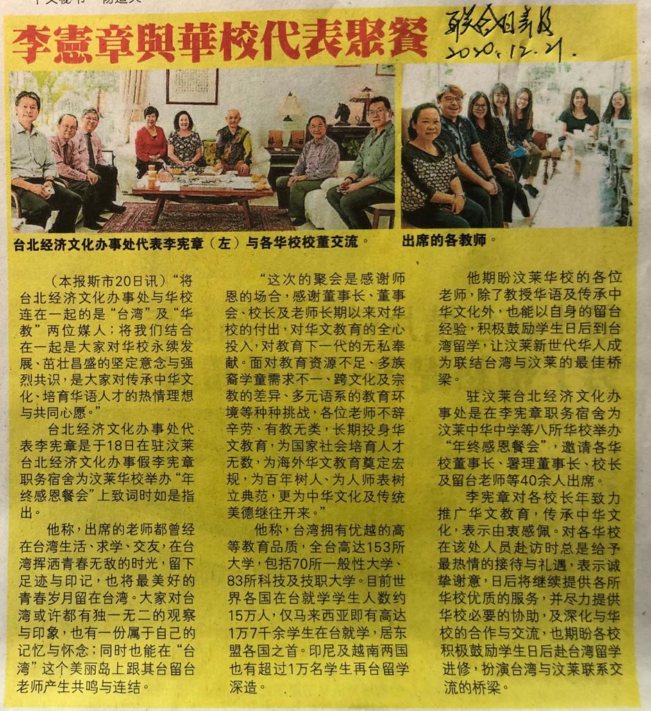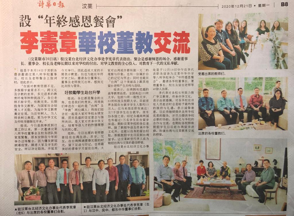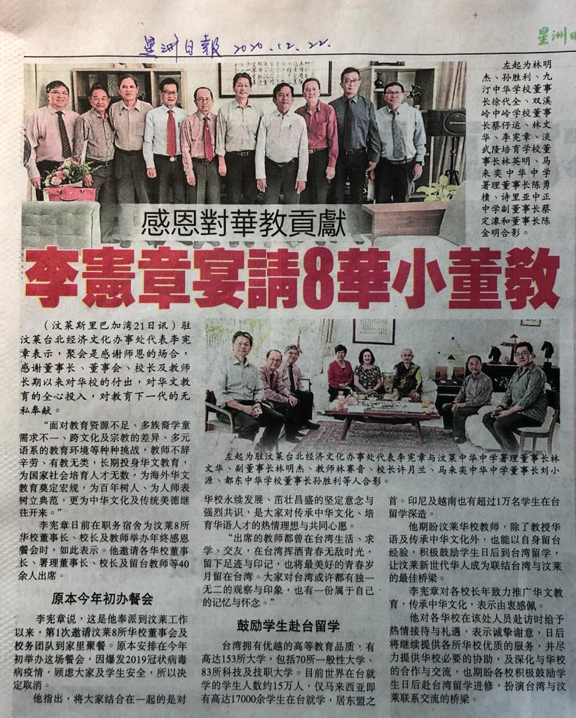 本處本(12)月19日中午在李代表職務宿舍為汶萊中華中學等八所華校舉辦「年終感恩餐會」,邀請各華校董事長、署理董事長、校長及留台老師等40餘人出席。李代表對各校長年致力推廣華文教育,傳承中華文化,表示由衷感佩。對各華校在本處人員赴訪時總是給予最熱情的接待與禮遇,表示誠摯謝意,日後將繼續提供各所華校優質的服務,並盡力提供華校必要的協助,及深化與華校的合作與交流,也期盼各校積極鼓勵學生日後赴台灣留學進修,扮演台灣與汶萊聯繫交流的橋樑。