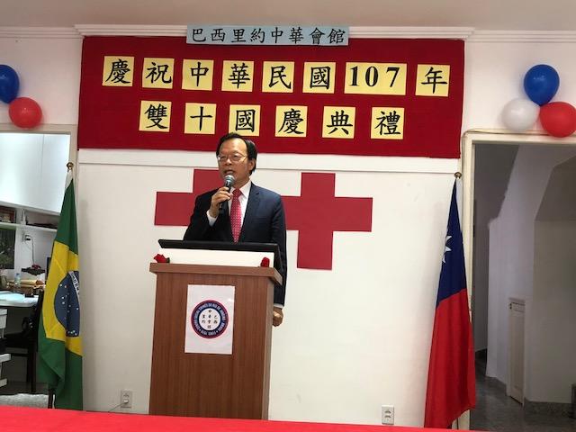 中華會館吳理事長水益首先致詞感謝何大使及張處長共同出席,顯示我政府重視里約僑社,盼里約僑胞繼續支持政府,作為政府在海外的堅強後盾。何大使則代表政府向僑胞致意,致詞感謝中華會館理監事出錢出力整修會館,為里約僑胞提供聚會場所,同時感謝會館辦理國慶活動,凝聚僑心,並請僑胞繼續堅定支持政府。