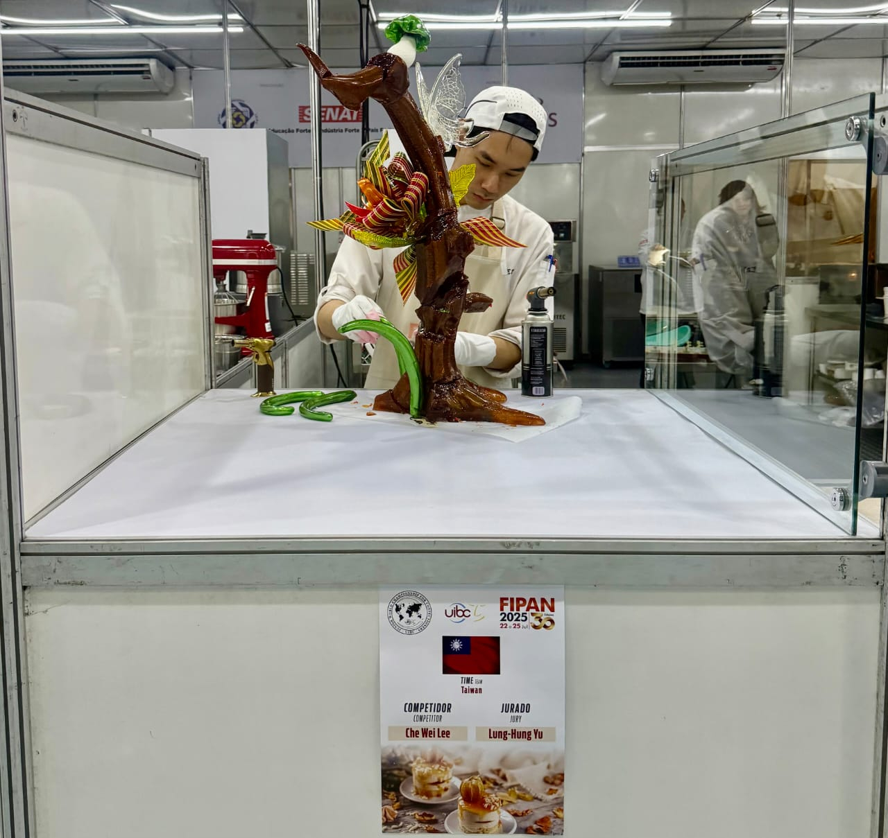 O competidor Lee Che-Wei é atualmente estudante do curso de Ciência e Tecnologia de Alimentos da Central Taiwan University of Science and Technology. Em 2024, conquistou a medalha de ouro na categoria de escultura em açúcar na competição de nível A das Olimpíadas Culinárias IKA, na Alemanha, demonstrando ampla experiência em competições internacionais. A Diretora Superintendente do Escritório Econômico e Cultural de Taipei em São Paulo, Sra. Angeles Chu, esteve pessoalmente no evento e em nome do Governo de Taiwan, parabenizou a equipe. O excelente desempenho de Lee Che-Wei nessa competição internacional foi reconhecido pelo Presidente e pelo Vice-Presidente da República da China em uma mensagem de congratulações.
