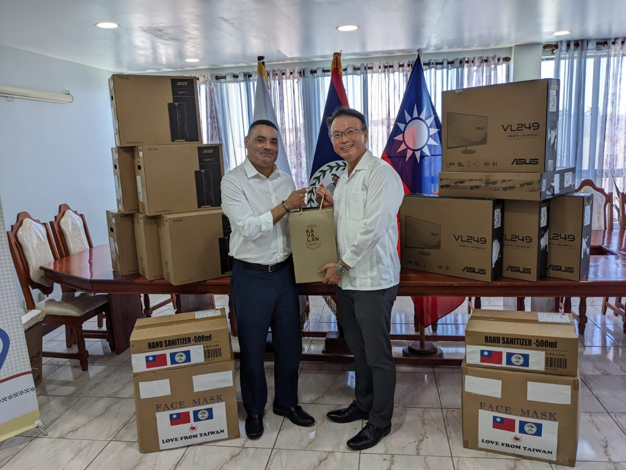 本館錢大使冠州與貝國教育、文化、科學暨科技部部長Francis Fonseca共同出席電腦及防疫物資之贈交儀式。(2022/04/13)