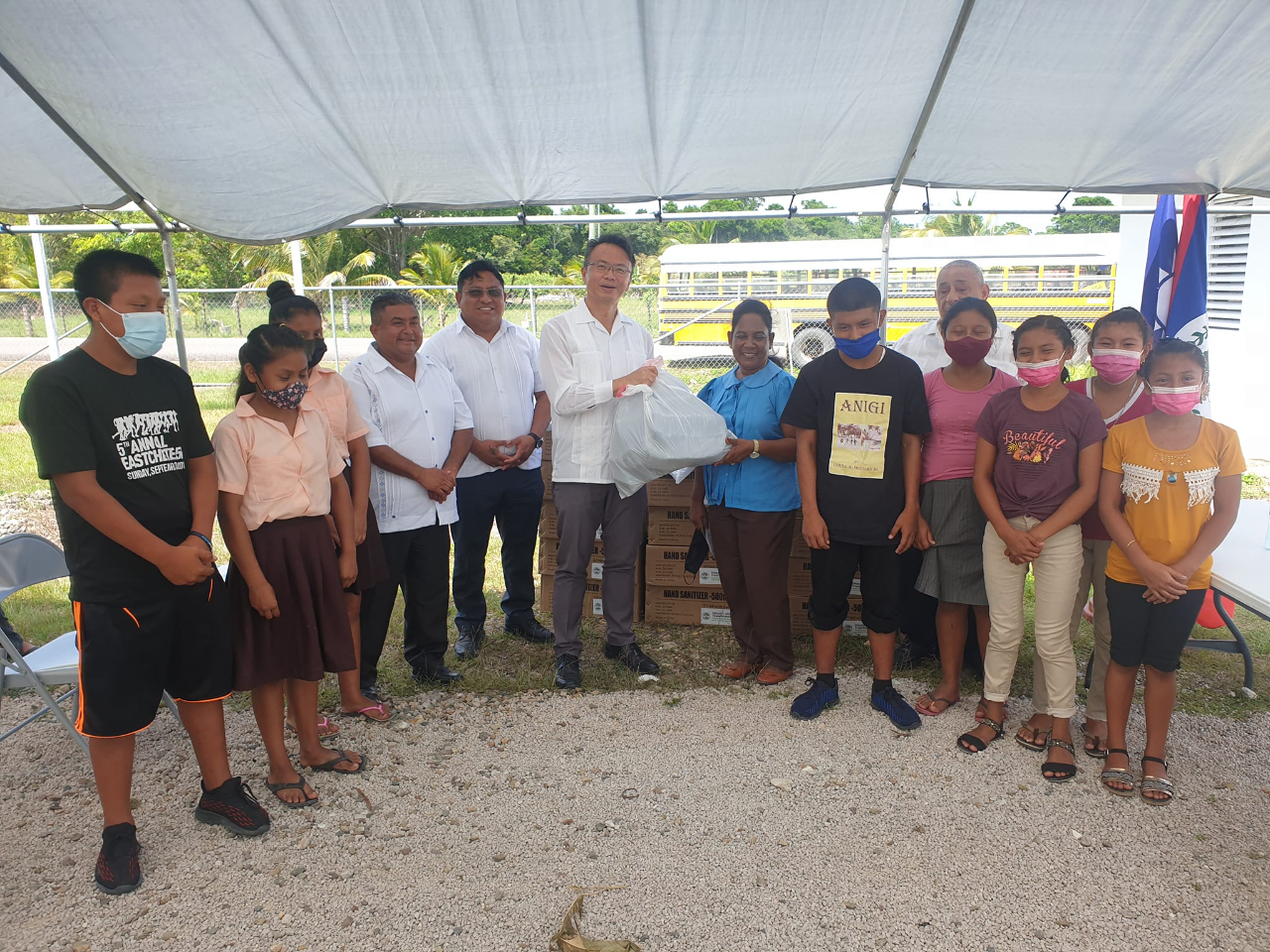 本館錢大使冠州應貝里斯鄉村轉型、社區發展、勞工暨地方政府部長Oscar Requeña邀請,與貝里斯財政、經濟發展暨投資部國務部長Michael Espat共同將一批防疫物資贈交給位在貝國南部Toledo區的四所小學。(2022/05/11)