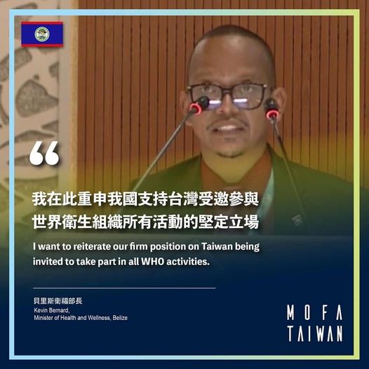 中華民國(台灣)駐貝里斯大使館感謝貝里斯衛福部長Kevin Bernard在本年5月24日的世界衛生大會(WHA)總討論中發言支持台灣。(2022/05/24)