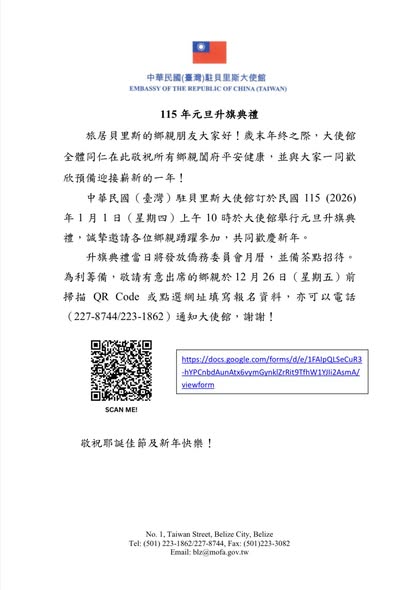 旅居貝里斯的鄉親朋友大家好!歲末年終之際,大使館全體同仁在此敬祝所有鄉親闔府平安健康,並與大家一同歡欣預備迎接嶄新的一年! 中華民國(臺灣)駐貝里斯大使館訂於民國115 (2026)年1月1日(星期四)上午10時於大使館舉行元旦升旗典禮,誠摯邀請各位鄉親踴躍參加,共同歡慶新年。 升旗典禮當日將發放僑務委員會月曆,並備茶點招待。為利籌備,敬請有意出席的鄉親於12月26日(星期五)前掃描QR Code或點選網址填寫報名資料,亦可以電話(227-8744/223-1862)通知大使館,謝謝! https://docs.google.com/.../1FAIpQLSeCuR3.../viewform