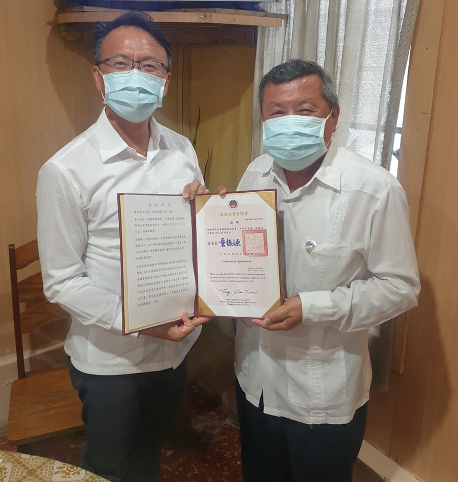 Ambassador David Kuan-Chou Chien had the pleasure to present Mr. Ramon Tseng the Certificate of Appointment as Senior Adviser of Overseas Community Affairs Council of the Republic of China (Taiwan), and thanked him for promoting Taiwan in Belize and further strengthening bilateral relations between the two countries!