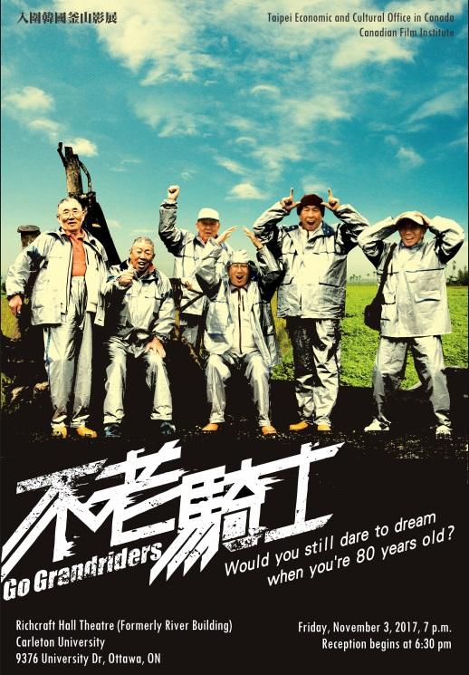 本處與加拿大電影協會將於11月3日(星期五)晚上7時合辦台灣電影《不老騎士》(Go Grandriders)欣賞會,地點在Carleton University的Richcraft Hall Theatre (前River Building Theatre), 9376 University Drive, Ottawa,免費入場,歡迎各界踴躍前往觀賞。